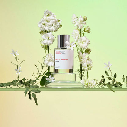 Fruity Jasmine presenta una mezcla de acordes verdes explosivos y una floralidad aguda. Combina jazmín, champaca (una flor parecida a la magnolia) y ylang ylang para crear un aroma floral totalmente nuevo, que no existe en la naturaleza. Esta creación contrastada se suaviza con notas dulces de ciruela y melocotón sobre un velo almizclado de sándalo.