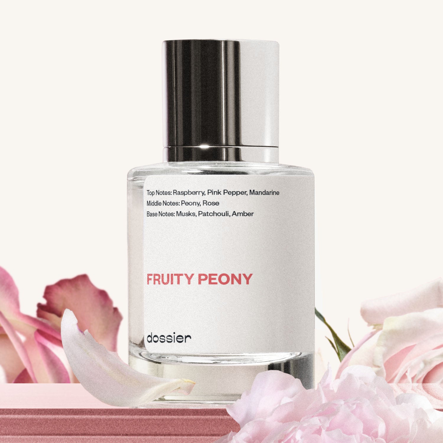 Inspirada en Prive Pivoine Suzhou de Giorgio Armani, Fruity Peony inicia con notas de frambuesa tierna, pimienta rosa y mandarina, que aportan un estallido de frescura y dulce elegancia. La fragancia se despliega con notas medias florales de peonías y rosa, con aroma a un ramo delicado, puro y aireado, que florece con una opulencia pura y tranquila.